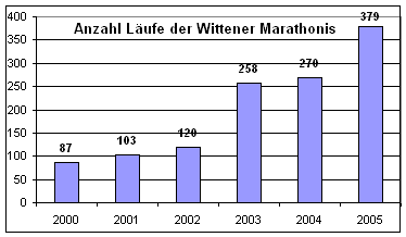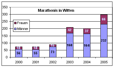 Marathon-Jahresrückblick 2005 Witten ist und bleibt eine Hochburg des Marathon-laufs. Eine Rekordzahl von 298 Wittener Sportlern legte 2005 die klassische Distanz von 42,195 Kilometern zurück. Zu dieser Entwicklung trugen nicht zuletzt der PV Triathlon und das Triathlon-TEAM Witten bei. Beide Vereine bereiteten zahlreiche Läuferinnen und Läufer auf den Ruhr-Marathon vor, bei dem allein 244 Wittener die Langstrecke erfolgreich absolvierten, viele von ihnen zum ersten Mal. Schneller, weiter, öfter: Niemand verkörpert dieses Motto besser als Birgit Schönherr-Hölscher. Für die Ausnahme-Athletin des PV Triathlon war 2005 das Jahr der Superlative. In Holland wurde sie Vize-Europameisterin über 100km, in Japan startete sie für Deutschland beim 100km-Weltcup, dreimal lief sie Distanzen über 70km, einmal 50km und noch 3 Marathons, den schnellsten in 2:58:04 Std. bei der DM in Regensburg. Dazwischen hatte sie auch noch die Kraft für den 4. Platz beim Ironman in der Schweiz. Noch weitere 4 Wittener Läuferinnen blieben beim Marathon unter 3,5 Stunden: Tina Christ (3:08:26, USC Bochum), Marie-Luise Maschmeier (3:09:10, ohne Verein), Kerstin Lohmeyer (3:11:39) und Silke Hamacher (3:17:39, beide TTW). Auch bei den Männern steht wieder derselbe Name an der Spitze der Jahresbestenliste: Marcus Klönne vom Triathlon TEAM Witten. Mit sehr guten 2:34:22 Std. war er beim Ruhr-Marathon diesmal "nur" zweitschnellster Deutscher, nachdem er diesen inoffiziellen Titel in den beiden Jahren zuvor für sich in Anspruch nehmen konnte. Und es gibt immer mehr schnelle Wittener. Noch 11 Marathonläufer blieben unter 3 Stunden: Dirk Oesterwind, Thomas Sittart, Klaus Böde, Dirk Strothkamp, Peter Pauls, Dieter Veldscholten (alle TTW), Heiko Hylla (TuS Ruhrtal), Ralf Kubeczka (BW Annen), Mathias Hölscher (PV), Michael Dünkelmann (LT Stockum) und Richard Fänger (TV Volmarstein). Bemerkenswert ist auch die Leistung des jüngsten Wittener Marathonläufers. Der 16jährige David Schönherr (PV) war bei seinem Debut nach 3:10:50 Std. im Ziel und tritt früh in die Fußstapfen seiner schnellen Mutter. Am anderen Ende der Altersskala