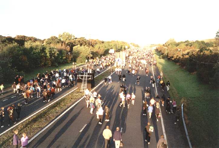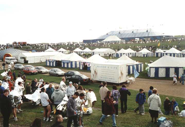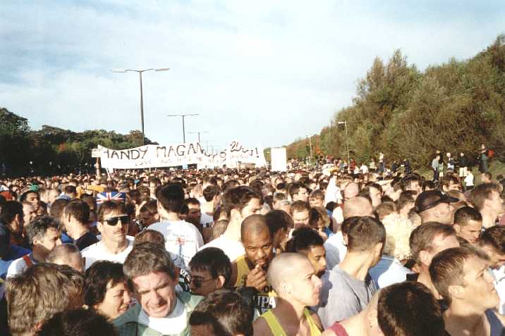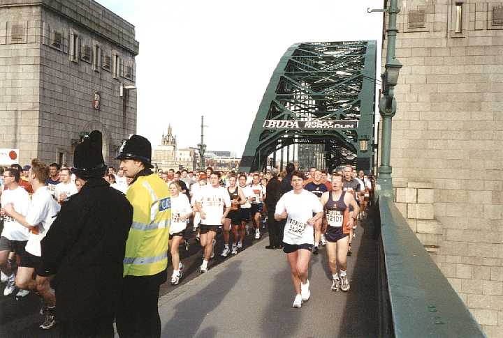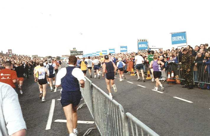 Die Atmosphäre Diese Läufermassen haben Zuschauer einfach nicht nötig. Die Teilnehmer unterhalten sich selbst, und zwar bestens. Wenn London zu 80% ein Fun-Run ist, der Great North Run ist es zu 95%. Das ganze ähnelt, ganz besonders in den hinteren Reihen, eher einer Karnevalsveranstaltung. Besonders bewegend fand ich, wie Hobby-Rollis an den für sie sehr schweren Anstiegen immer wieder mit Schulterklopfen und ein paar Worten aufgemuntert wurden. Auch mit ganz normalen Rollstühlen waren ein paar handycapped fellows unterwegs, die von laufenden Freunden über die 21 km geschoben wurden. |