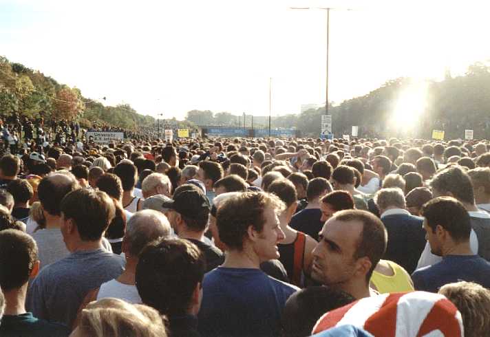 So war es kein Problem, pünktlich zum Start (10.10 h) zu kommen. Bereits eine Stunde vor dem Startschuss sollte man den Kleiderbeutel abgeben, und das bei 8° (*bibber*). Ich hatte einen extra dicken, körperlangen Plastiksack dabei und noch ein Wegwerf-T-Shirt, selbst damit hab ich gefroren. Hilfreich war, dass man sich in den Doppeldecker-Kleidersackbussen umziehen und aufhalten konnte. Die 40 Busse waren nicht ausgelastet, offenbar organisieren sich die meisten Läufer selbst. Es wird ohne Chip gelaufen, die leistungsgerechte Startaufstellung wird, wie es sich für fair play gewohnte Briten gehört, nicht kontrolliert. Und alle starten zugleich in einem Block. Auch dies ein Zeichen dafür, dass dieser Lauf von den weitaus meisten Teilnehmern nicht als Bestzeitversuch angegangen wird. |