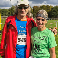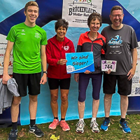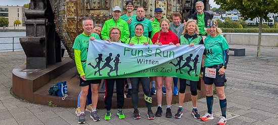 Über 200 Teilnehmer lassen sich den 9. Brückenlauf in Wetter nicht entgehen. Einzige Wittenerin ist Anne Heibing (PVTG/TGH Wetter), die 5,6 km in 29:20 läuft und damit 4. Frau und natürlich Siegerin W70 ist. Die immer noch aktive Sportlehrerin bringt auch 45 Kinder der Bergschule an den Start und läuft zusätzlich auch noch in der Staffel der ev. Kirchengemeinde Alt-Wetter (Foto). Nicole Möller (TSV Herdecke) ist über 11 km 4. Frau in 54:12. Ayhan Kural (beide TSV Herdecke) ist 5. Mann in 47:51.