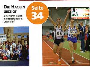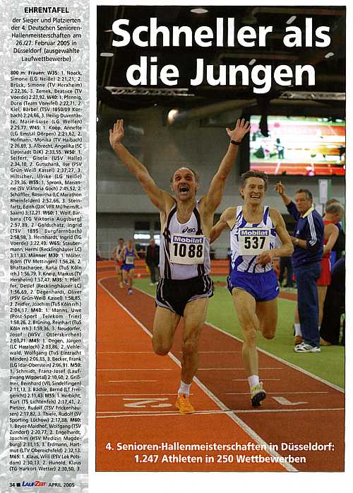 Niederlage. aus Condition 04/2005 "... Die größte Überraschung lieferte Klaus Augustin (Triathlon-Team Witten) über 3000m der Klasse M55 ab: In einer dramatischen Spurtentscheidung setzte sich der bisher eher als Straßenläufer bekannte Westfale gegen den sieggewohnten Winfried Schmidt (TuS Köln rrh.), seines Zeichens Weltmeister in der Halle und Europameister im Freien, mit 15/100 Vorsprung durch." aus Laufzeit 04/2005 Das Magazin macht schon in der Inhaltsangabe mit dem Foto von Klaus auf: