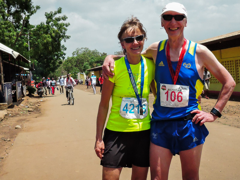 Von der Strapaze gezeichnet, aber unübersehbar stolz. Es gibt verschiedene Medaillen für den halben und den ganzen Marathon.