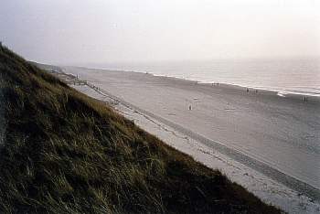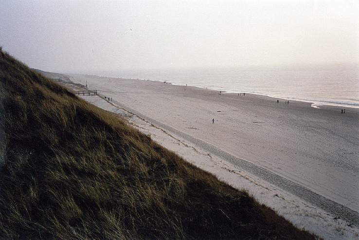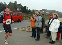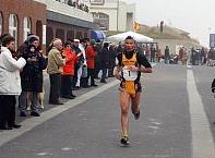 auf der Kurpromenade Das Publikum ist außergewöhnlich beifallsfreudig. Selbst einzeln stehende Zuschauer werden nicht müde zu klatschen und die Läufer aufzumuntern. Da hilft wohl auch die Urlaubsstimmung, und vielleicht die Kälte. Die Aussicht in die Landschaft wird nicht besser. Ich suche mir andere attraktive Fixpunkte und laufe einige km hinter der späteren W40-Siegerin. Bald geht es in den Dünenbereich, und kurz hinter Kampen müssen die Beine sich umstellen. Unser Pfad ist plötzlich ein Gemisch aus Sand und Kiesel. Wir versuchen eine festgetretene Spur zu finden, eher vergeblich. Dazu kommen einige mühsame Steigungen und der Richtungswechsel nach Ost. Das heißt, der kalte Wind bläst uns jetzt geradewegs ins Gesicht. Zieleinlauf