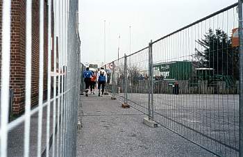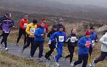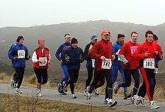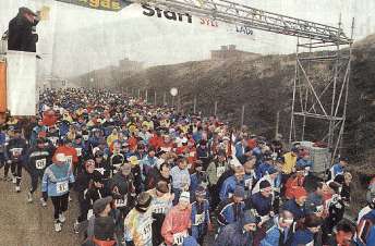 im Nebel Ich stehe sehr weit vorne, aber hinter der allerersten Reihe geht es eher gemütlich auf die Strecke. Für die ersten km ist die Straße gesperrt, dann müssen wir auf den Radweg. Doch der ist hier so breit wie andernorts die Straßen. Vermutlich hat man sonst einen schönen Blick aufs Wattenmeer, heute aber zeigt sich Sylt eher als eintönige Nebelsuppe. Bis Westerland gehts über 15km weitgehend geradeaus. Der böige Wind kommt von Südost und schiebt uns von der Seite. Ich hänge mich an zwei mollig warm angezogene Veteranen und lausche ihren Erfahrungsberichten von den Marathons der Welt. Und mein Respekt steigt und steigt: "... den Rennsteig lauf ich jetzt zum 16. Mal". Das Tempo ist mit 4:45min/km ein klein wenig schneller als geplant, aber der Puls bleibt unterm Limit. Ist das der Wind, oder ist meine Form so gut? Die alten Kämpen laufen gleichmäßig wie ein Uhrwerk. An der Verpflegungsstation nehmen sie sich aber mehr Zeit als ich. Jetzt muss ich zwar das Tempo allein halten, dafür geniesse ich die Ruhe. Ab und zu laute Anfeuerungsrufe der auf der Straße nebenher fahrenden Betreuer und die lebhaften Übergabe-Stationen für die 51 Staffeln bringen etwas Abwechslung in die lange Gerade im Dunst des Nebels. Klatschmarsch