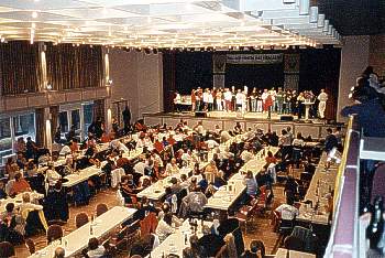 Dass der Franz in Wirklichkeit ein verschmitztes Lächeln im Gesicht trägt, merkt man erst, wenn man ihn selbst erlebt. Die Einladung ist gespickt mit Warnungen, Verhaltensregeln, Ge- und Verboten. Fast könnte man zwischen den Zeilen lesen: Bleibt zuhause, wir sind schon genug. Warum nur ist dieser Lauf so beliebt? Irgendwas muss doch dran sein. Ein TopTen-Lauf - Abhaken der Vorurteile Vergessen war der Termin nicht, und als ich in Helges Laufforen den Tipp las, doch einfach bei der Nudelparty nach freien Startnummern Ausschau zu halten, stand mein garnicht so spontaner Entschluss wenige Tage vor dem Lauf fest. Das klappte auch wie am Schnürchen. Anreise mit Bahn-Sparpreis (99€), Hotelzimmer am Freitag noch telefonisch gebucht und keine 2 Minuten vor Ort, da hatte ich meine Startberechtigung. Der bedauernswerte Gerd H. aus List hatte sich am Tag zuvor das Hirn erschüttert und gab mir seine Nummer 714 zum Normalpreis. Teuer wurde es trotzdem, denn die Umschreibung kostete 20€ extra. Mit insgesamt 45€ für 33km gehört Sylt so auch bei den Preisen zu den TopTen-Läufen. Also schon mal ein Vorurteil bestätigt. Dieser kleine Schock wurde aber schnell verdaut mithilfe von höchst schmackhaften Nudelportionen. Der große Saal bietet Hunderten von hungrigen Läufern Platz an langen Tischen, wir werden mit Musik unterhalten, und als Höhepunkt erscheint eine Tanzgruppe, die alles andere als Folklore auf die Bühne fetzt und den Saal in Stimmung bringt. Hier merke ich bald, dass dies kein Touristen-Event, sondern eine Familientag der Läufergemeinde ist. Zum Wohlfühlen. Veteranen