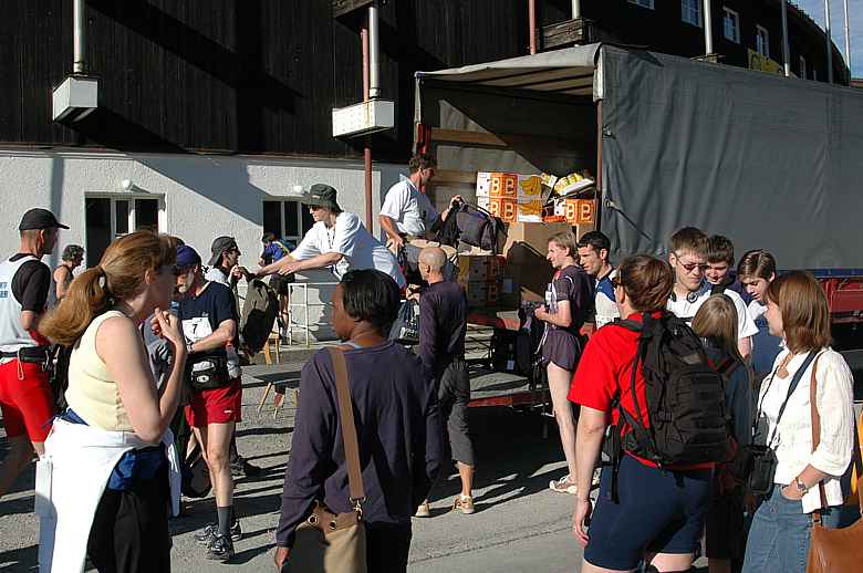 die Rucksäcke für den Transport zum Gipfel abgegeben werden.