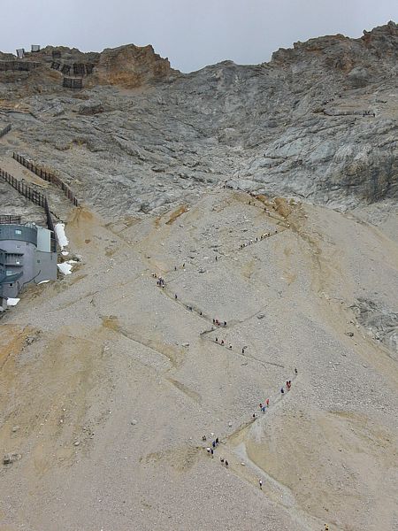 Gänsemarsch: Die Läuferschlange windet sich im steilen Geröll dem Gipfelgrat entgegen.