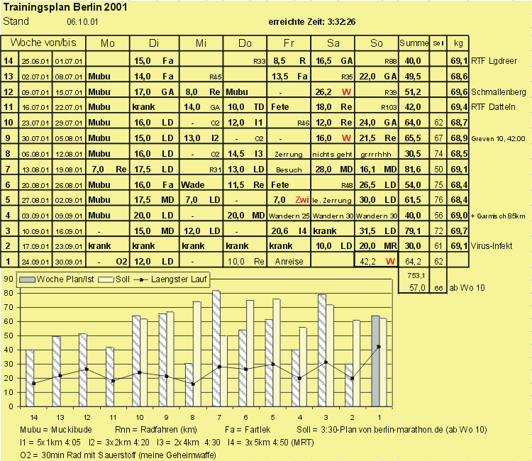 Am 30.09.2001 sollte es endlich klappen mit der Zeit unter 3:30. Es ging knapp daneben, 3 min haben gefehlt. Woran es lag, kann vielleicht diese kleine Analyse aufdecken. Oder war das Training nicht ausreichend? Den Trainingsplan findet Ihr weiter unten. |