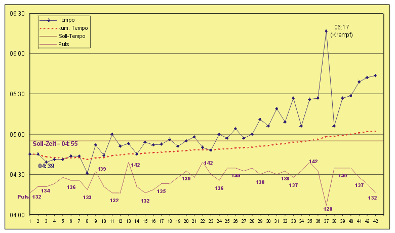 Im nachhinein sieht es doch so aus, dass ich trotz aller Vorsicht zu schnell gestartet bin. Dabei war aber der Puls bis km 18 im Durchschnitt in Ordnung. 138 bedeutet für mich 85%. Trotzdem konnte ich ab km 29 nicht mehr mein Wunschtempo laufen. Es ist deutlich zu sehen, dass ich auf km 30, 32 und 34 versuche, das Tempo wieder aufzunehmen, aber jedes Mal wieder zurückfalle, und zwar immer stärker. Den Krampf bei km 37 muss ich wohl auf Dehydrierung zurückführen. Dafür spricht auch, dass ich im Ziel massive Kreislaufprobleme hatte. Auch nach der Dehnpause kann ich noch einmal forcieren, aber schließlich kommt bei km 39 der Hammer mit aller Macht. Es gelingt mir nicht mehr, den Puls zu aktivieren. Ich schleppe mich nur mit intensiver "Kopfarbeit" ins Ziel. Fazit: Ich habe die Regel bestätigt, dass man Minuten, die zu Anfang gewonnen wurden, am Ende mehrfach zurückgeben muss. |