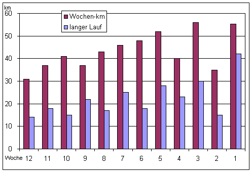 | Woche | vom | bis | km je Trainingseinheit (Reihenfolge innerhalb der Woche nach Wunsch) | Wochen summe | ||||