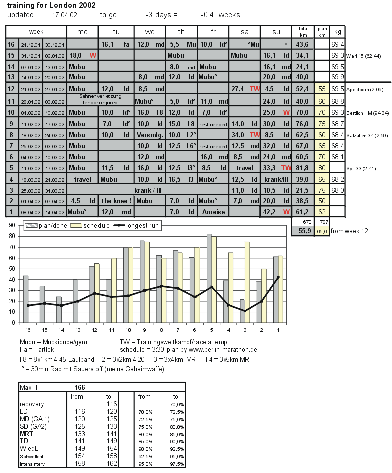11/04/02: Things packed, after checking everything twice. Nervous. Excited. 11.20pm. Take off in less than 7 hours. Finally. Look forward very much to meeting the internet friends which I feel already familiar with. Weatherforecast really promising. Dry, 11/51°, no wind. Nervous. Try to get to sleep now. Still mails arriving. Sorry, no answer from now on. Many thanks for all your good wishes. Butterflies. 07/04/02: A cautiously happy Uli is reporting today. It looks like I will come back just in time. Enthusiastically I completed 12 very hilly miles this sunday morning, without any problems. Hopefully nothing more will get sour during the final week. As a precaution I will stick to the rheuma-pills till race day. I have to admit I won't be free of dopes, but I announce it here openly, thats the way like the elite does it, don't they ;-). Comparing my 12-week- schedule I have missed 60 miles overall. Nevertheless I will try to head for 3:30 from the start on, and will see, how far I will be able to hold the speed. Good luck to all London runners. I am sure you will enjoy it, it will be a great day again. 04/04/02: I am sure you know the experience when you go out for a run and with every step you do you listen into your body if the injury reverts again. I was really scared when starting my test run today. But everything went well and I can breathe deeply tonight (do you hear?). 38 min without any problems. I didn't risk any more. Now I can hope again not only to make it to the start but also to the finish. Next sunday I will try to run the usual sunday circle (10m). 01/04/02: