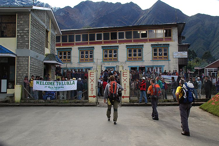 The tourists are welcomed by countless on-lookers and porters, guides
