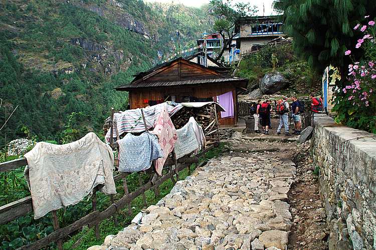 Dorfstraße: In Monjo, auf halber Strecke zwischen Lukla und Namche Bazar, übernachten wir zum ersten Mal. Village High Street: At Monjo, half way from Lukla to Namche Bazar, we stay overnight for the first time.