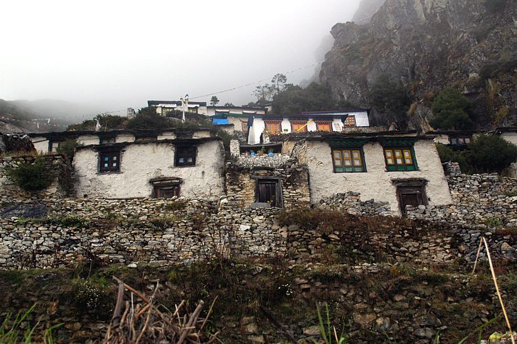 Hanglage: Die Wohnhäuser der Mönche lehnen sich eng an den Berg. Hillside: The monks' houses lean against the mountain.
