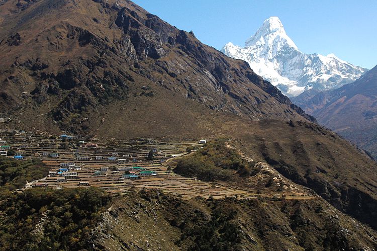 Postkartengerecht: Auch die allgegenwärtige Ama Dablam wacht über Phortse. Living high: Phortse is guarded by the omnipresent Ama Dablam.