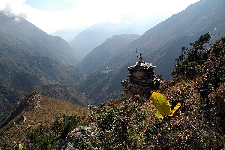 Aussicht: Blick von Phortse auf das Tal des Dudh Koshi in Richtung Süden, zurück nach Namche Bazar. Valley View: Looking out from Phortse to the Southern valley of Dudh Koshi, in direction of Namche Bazar.