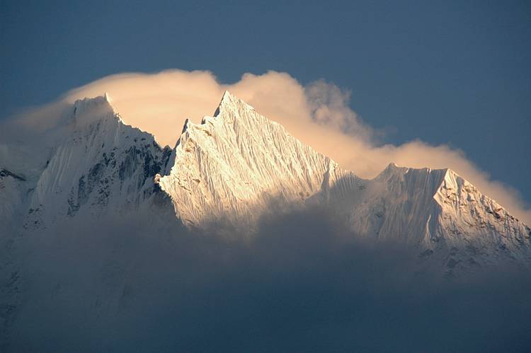 Abendstimmung: Der Gipfel des Thamserku (6.618m) ragt aus den Wolken. Evening Spirit: The peaks of Thamserku (6.618m) surrounded by late clouds.