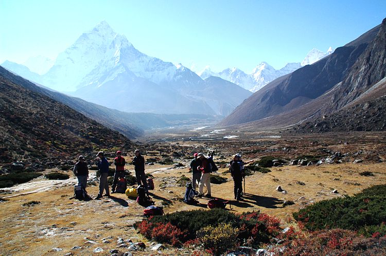 Rückblick: Aus dieser Perspektive nicht ganz so markant, aber es ist immer noch unsere Wegbegleiterin Ama Dablam. View Back: From this new perspectve it is less distinctive, but it still is our true companion, Ama Dablam.