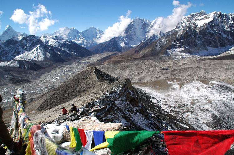 Schaubühne: Links zieht sich der Khumbu-Gletscher über ca. 10 Kilometer nach Süden. Mountain Arena: To the left the Khumbu glacier is on its way of 10 kilometers to the South.