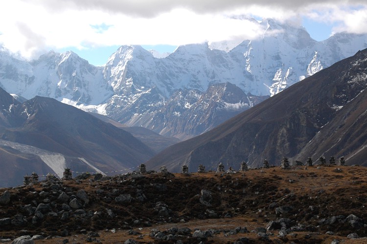 Gedenksteine: Auf der Hochebene in 4800m vor dem Abstieg nach Duglha. Memorials: High on the pass at 4800m before descending to Duglha.