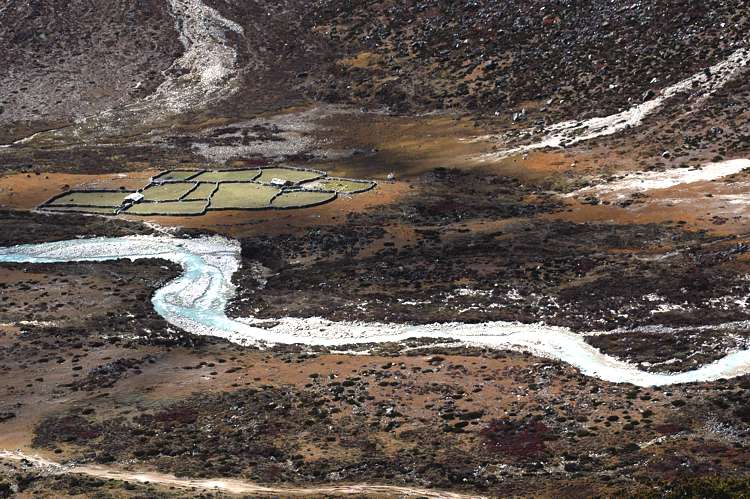Grünflächen: Im Weiler Phulung Kharka (4300m) wird jeder Meter zum Anbau genutzt. Green Acres: At the hamlet of Phulung Kharka (4300m) every plain square meter is used for planting.