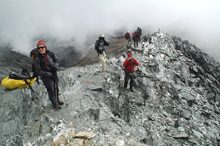 Hochgefühl: Trotz der weitgehend vernebelten Aussicht fällt der Abschied vom Gipfel offensichtlich schwer. Feeling High: The view from the top is somewhat limited today but nevertheless it is not easy for us to leave.
