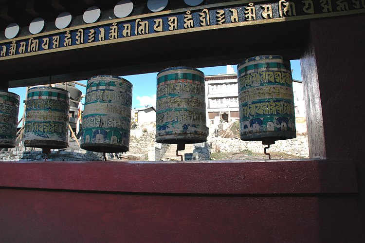 Gebetsmühlen: Es gibt sie handbetrieben, wie hier, oder die arbeitssparende Variante, wasserbetrieben. Prayer Wheels: There are different versions, manual ones like in the picture and - more economical - water driven.