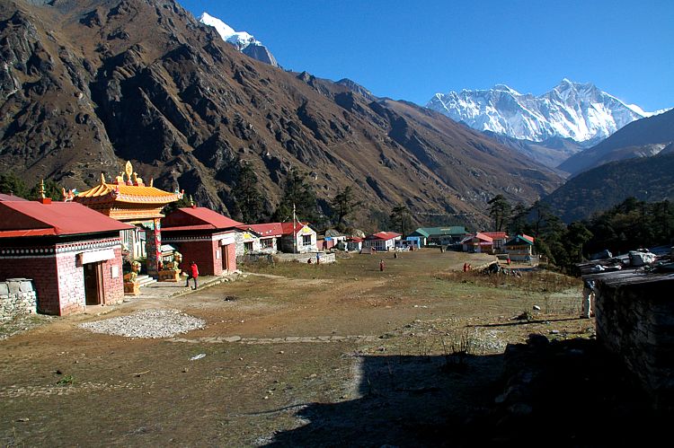 Klosterblick: Hinter der Felswand von Nutpse und Lhotse schaut nur knapp der Gipfel des Everest hervor. Abbey View: Behind the South Wall of Nutpse and Lhotse the very top of Everest can be spotted.
