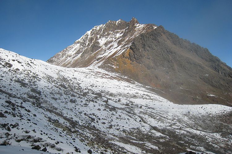 Finale: Vom Ensillada-Sattel (4.770m) geht der Blick hinauf zum felsigen Grat des Nordgipfels.