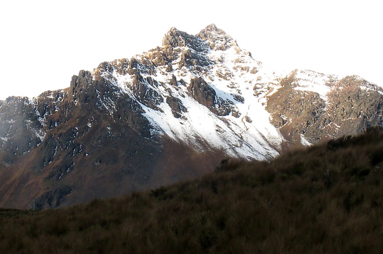 Im verschneiten Hang ist unser Abstiegsweg erkennbar.