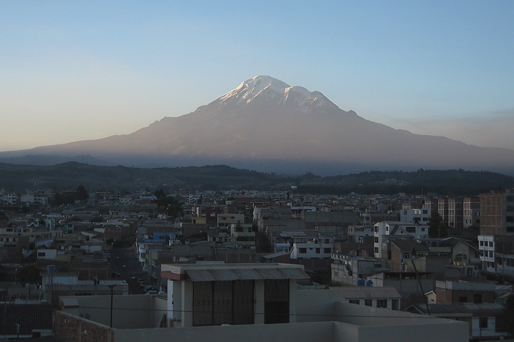Sonnenaufgang: Das Massiv des Chimborazo über den Dächern von