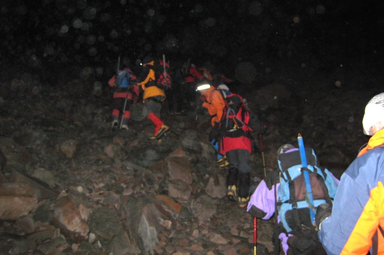 Entschlossen: Abends um 10 machen wir uns auf den Weg nach oben. Start ist auf ca. 4800m in der Nähe der Carrel Hütte.