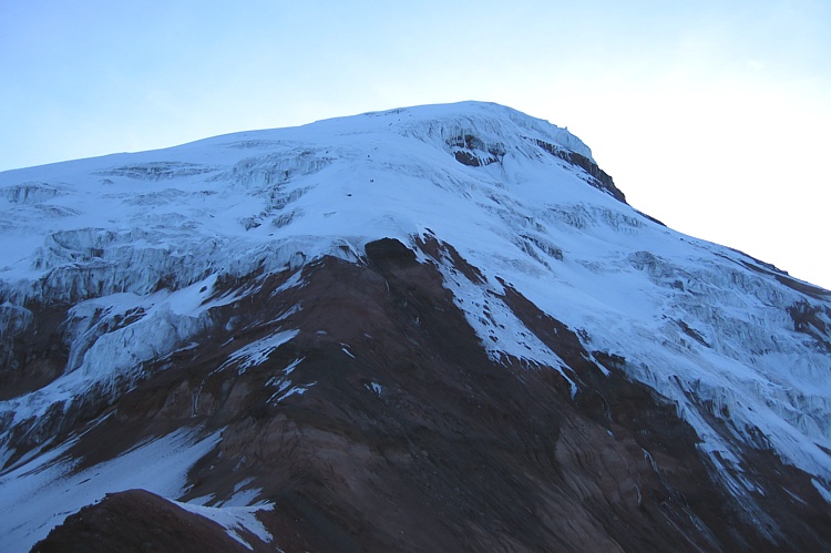 Tageslicht: Bei Sonnenaufgang sind wir schon fast 8 Stunden unterwegs. Blick auf den Ventimilla Grat, über den unsere Anstiegsroute verläuft. Auf dem Eis sind Gruppen von Bergsteigern zu erkennen. Das sind wir!