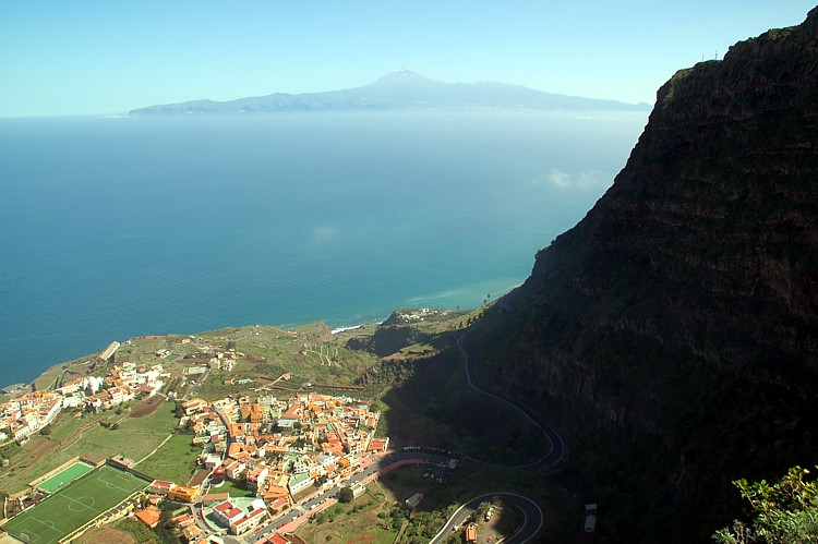 Tief: Die klassische Postkarten-Ansicht der Insel ist der Tiefblick auf das Dorf Agulo mit Teneriffa am Horizont. Rother-Wanderung Nr. 42