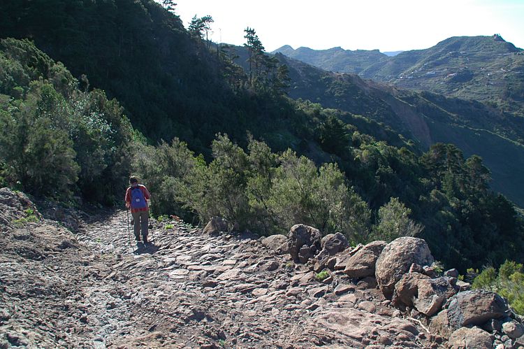 Historisch: Meist geht es auf uralten, gut ausgebauten "caminos" durch die steile Landschaft Gomeras. Hier auf dem Abstieg vom Besucherzentrum in Juego de Bolas nach Agulo. Rother-Wanderung Nr. 42