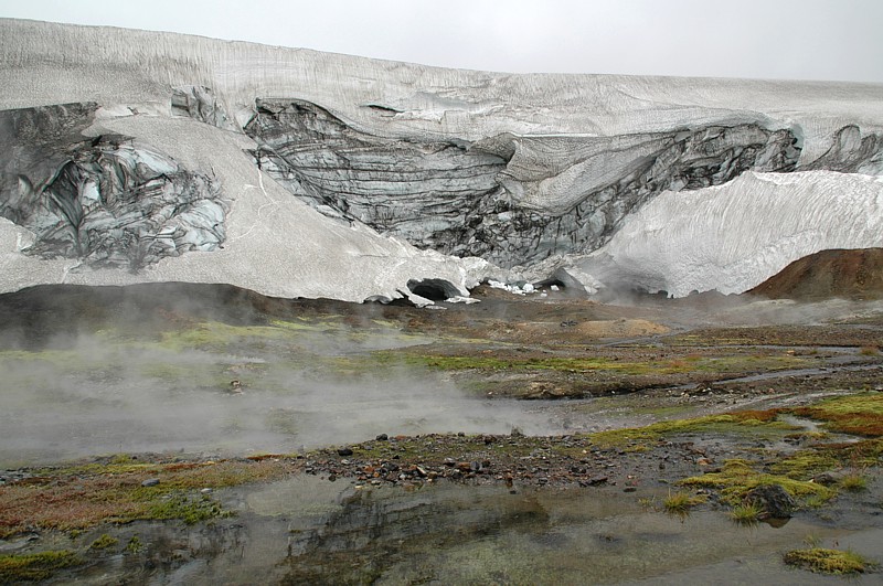Gletschereis, davor sprudelt kochend heißes Wasser aus den Quellen!