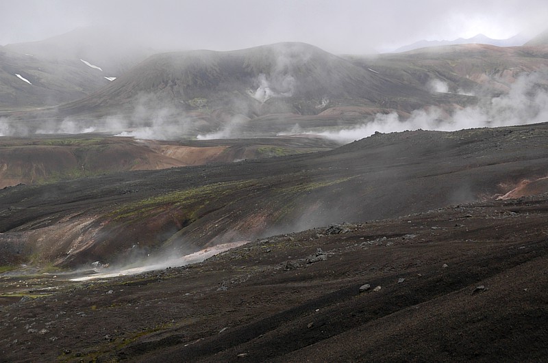 Die Erde kocht: Soweit das Auge reicht, überall verdampft das brodelnd heiße Wasser. Boiling grounds: As far as you can view, everywhere the boiling hot water is steaming in the air.