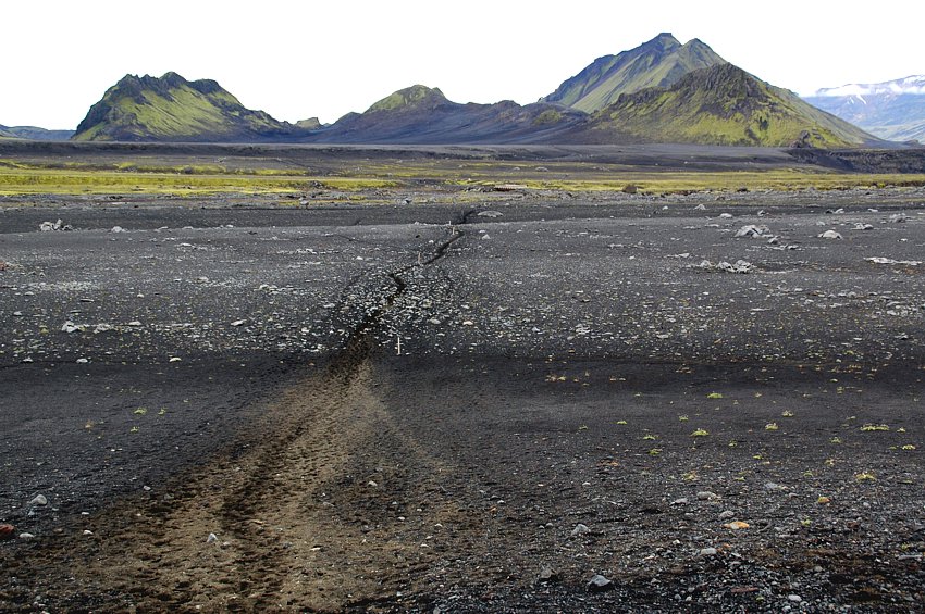 Schwarze Wüste: Pflöcke führen die Wanderer sicher durch die Ebene zu einer hilfreichen Brücke. Black desert: Signposts lead the walkers safely through the plain.