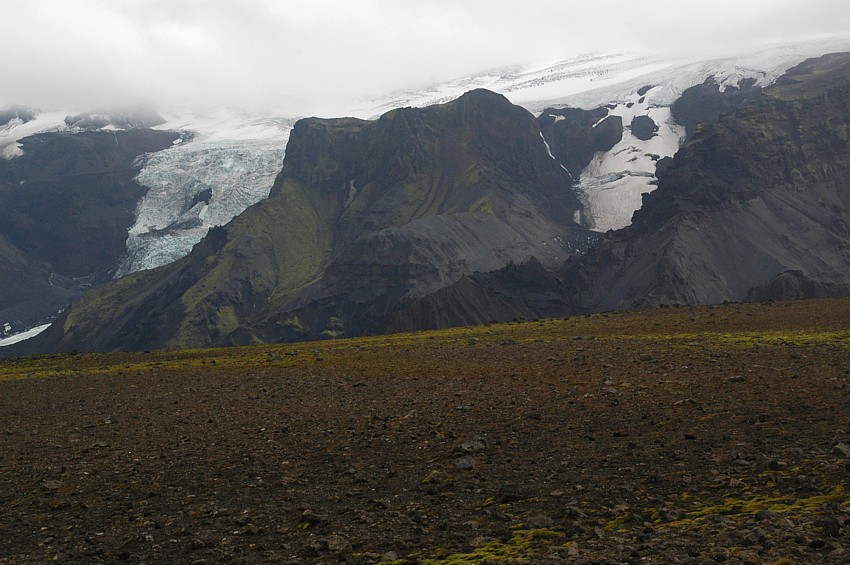 Eisgesichter: Aus tiefhängenden Wolken schauen Gletscherzungen den Wanderen entgegen. Ice faces: From low clouds icy tongues loom down to the passing walker.