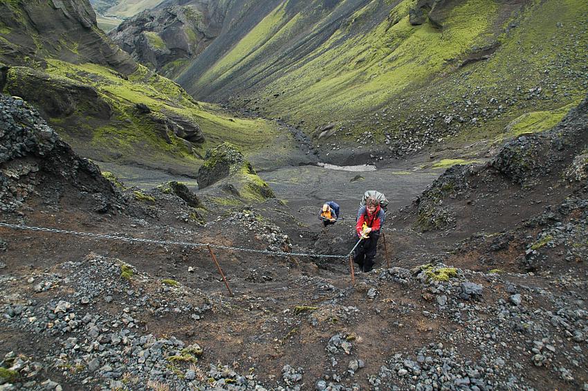 Kletterhilfe: Der steile Anstieg zum Heljakambur wird durch Ketten erleichtert. Climber's help: The steep ascent to Heljakambur is helped by installed chains.