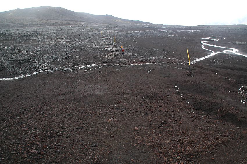Mondlandschaft: Ohne die leitenden Pflöcke würde hier nur noch ein Kompaß helfen. Moonscape: Without the guiding plugs one would soon be in need of a compass.