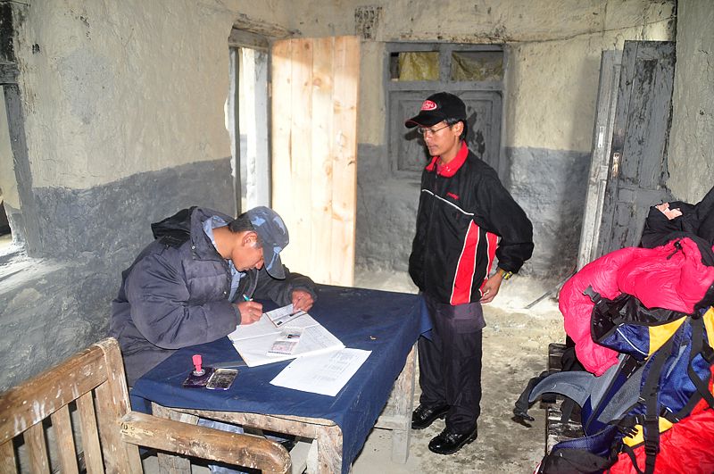 Humde Checkpoint: Draußen stürmt es mit dichtem Schneetreiben. Der Beamte hat sich in sein Büro zurückgezogen.