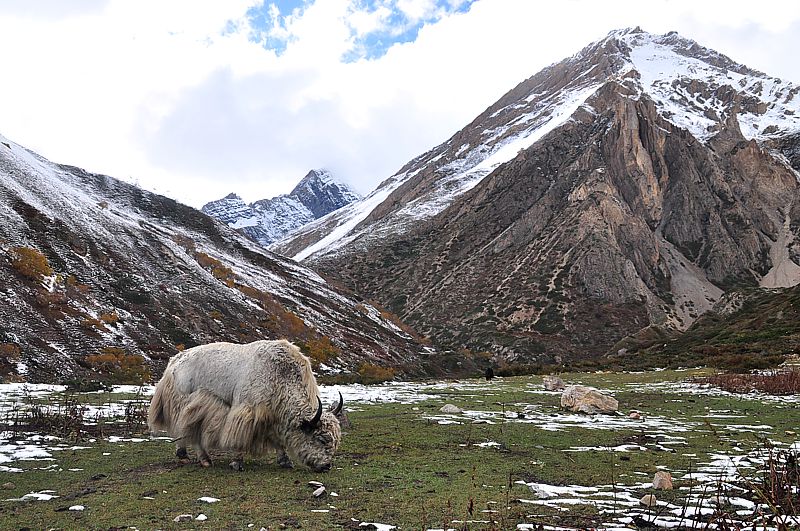 Yak: Das Yak-Rind ist ein vorbildliches Nutztier. Es trägt Gepäck, gibt Milch sowie Fleisch und Leder, und die Ausscheidungen werden getrocknet und zum Heizen verwendet.