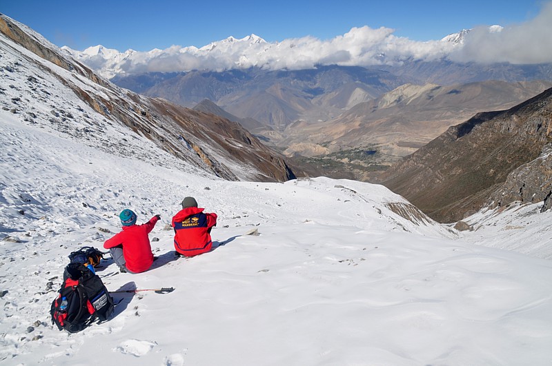 Übern Berg: Nach langem, steilem Abstieg ist die Schneegrenze erreicht und der Blick auf Muktinath frei.