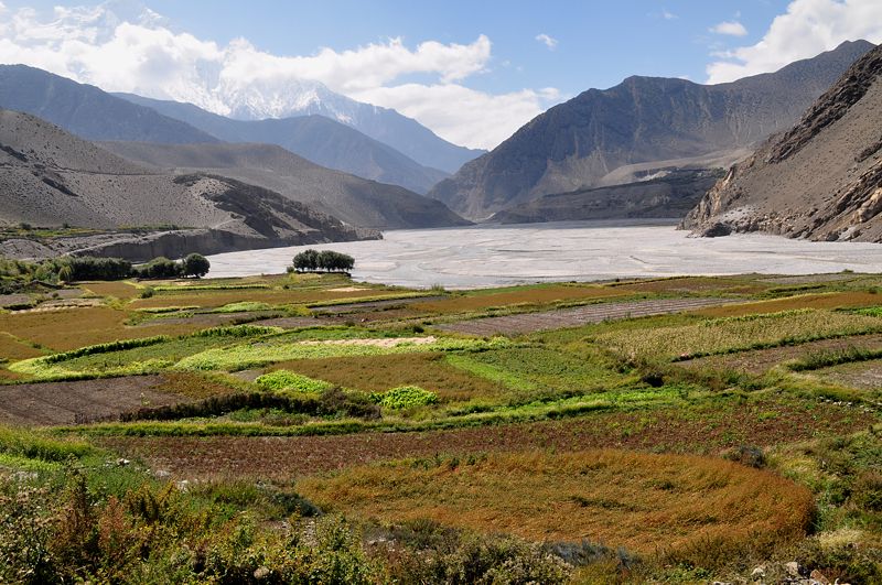 Nach Süden: Das breite Flusstal des Kali Gandaki ist zunächst noch grün, weil von den Einwohnern Kagbenis bestellt.