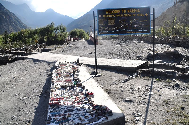 Marpha: In der Hauptstraße von Marpha reiht sich Shop an Shop. Ein Dorfrundgang wird für den Touristen zum Spießrutenlauf zwischen geschäftstüchtigen Verkäufern.