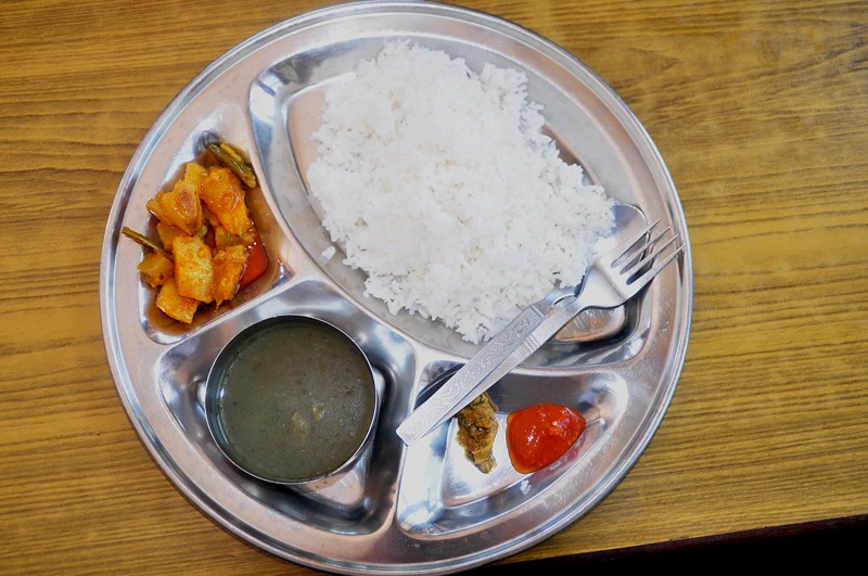 Mittagspause: Eine Basisversion von Dhal Bat. Nepalis essen das Nationalgericht jeden Mittag und jeden Abend. Und zwar mit den Fingern, auch dann, wenn für die Touristen das Besteck auf dem Tisch steht.