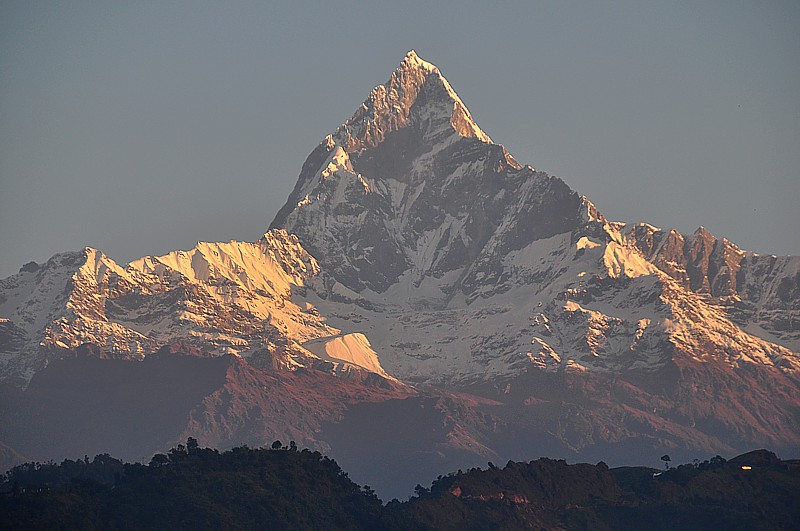 Machhapuchhre: "Fishtail Mountain", das Matterhorn des Himalaya, sieht nur aus dieser Richtung aus wie Zermatt Hoch Zwei. Aus anderer Perspektive erklärt sich dann der Spitzname von selbst.