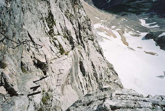 Luftig: Unterhalb der Riffelwandspitzen verläuft dann der eigentliche Klettersteig. 2-3 Stunden unterhaltsames Turnen in oft ausgesetzter Lage, aber immer perfekt gesichert. Das Drahtseil verläuft praktisch durchgehend vom Gletscherrand bis zum Gipfel. Dennoch mahnen mehrere Gedenk-tafeln für abgestürzte Bergsteiger, in der Konzentration nicht nachzulassen.